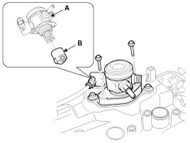 27. Connect the fuel hose (A) and PCSV (Purge control solenoid valve) hose (B).