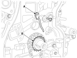 7. Install the timing chain auto tensioner (B) and remove the stopper pin (A).