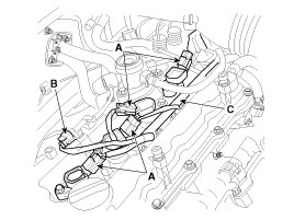 Apply engine oil to the O-ring (A) of the high pressure fuel pump, the roller tappet (B), and the protrusion (C). Also apply engine oil to the groove where the protrusion is installed.