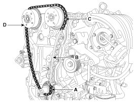 Crankshaft sprocket (A) -> Timing chain guide (B) -> Intake CVVT sprocket (C) -> Exhaust CVVT sprocket (D).