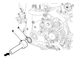 11. Install the crankshaft front oil seal (A) using SST (09214-3K000, 09231-H1100) (B).