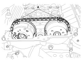 (2) Mark the timing chains (A) on the timing marks of the CVVT sprockets.