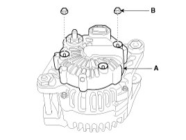 1. Remove the alternator cover (A) using a screw driver after loosening the nuts (B).