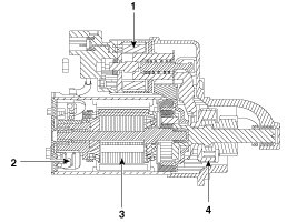 The contacts close and the starter motor cranks. In order to prevent damage caused by excessive rotation of the starter armature when the engine starts, the clutch pinion gear overruns.