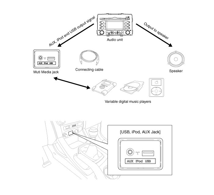 The AUX, iPod and USB JACK on the center console is for customers who like to listen to external portable music players like the MP3, iPod, earphone, USB memory stick, CD player and etc., through the vehicle's sound system when it is linked to this jack.