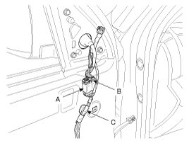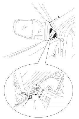 2. Push the lock pin (B), disconnect the tweeter speaker connector (C).