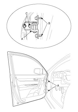- After installing the door, check for a flush fit with the body, then check for equal gaps between the front, rear, and bottom, door edges and the body. Check that the door and body edges are parallel. Before adjusting, replace the mounting bolts.