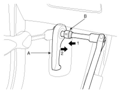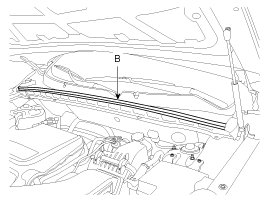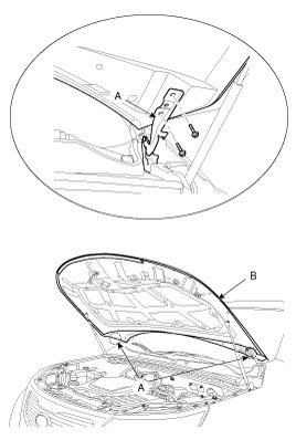 1. Detach the adhesive, then remove the hood weatherstrip (B).