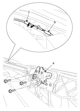 2. Disconnect the hood latch cable (B) and release cable (C).