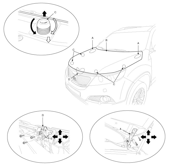 3. After loosening the hood latch (D) mounting bolts, adjust the latch by moving it up or down, or right or left.