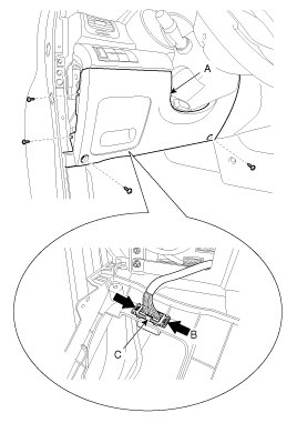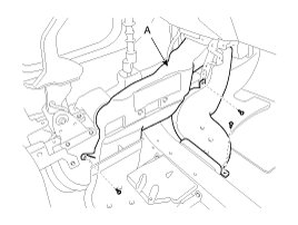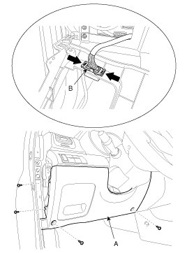 2. After loosening the crash pad lower panel mounting screws, remove the lower panel (A).