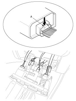 2. Disconnect the lock pin, disconnect the passenger`s air bag connector (A).