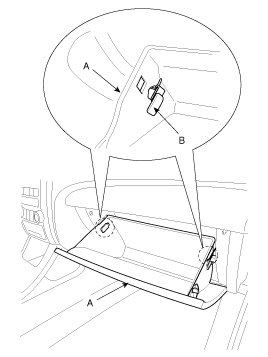 4. Disconnect the pin (A), then remove the glove box (B).