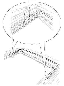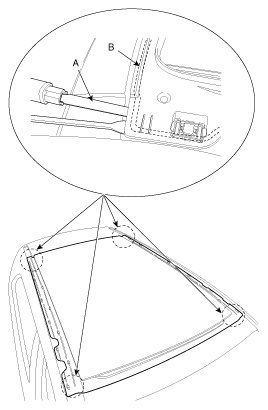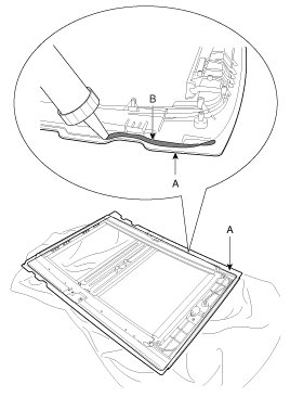 7. Pack adhesive into the cartridge without air pockets to ensure continuous delivery. Put the cartridge in a caulking gun, and run a bead of sealant (B) around the edge of the panorama roof (A) as shown. Apply the adhesive within 30 minutes after applying the glass primer. Make a slightly thicker bead at each corner.