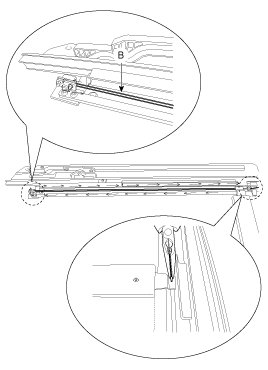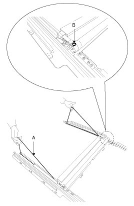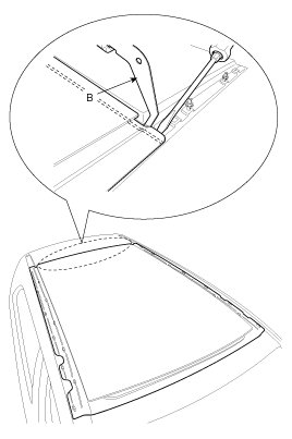 3. The roof panel (A) should be even with the glass (B) weatherstrip, to within the standard value "E" all the way around. If not, make the following adjustment.
