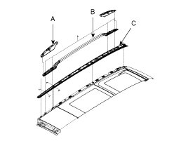 5. Remove the roof rack cover (A), roof rack (B), roof molding (C).