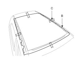 3. Temporarily place the panorama roof (B) on the vehicle. Center the roof on the body and mark the position with a piece of tape (C) on each side.