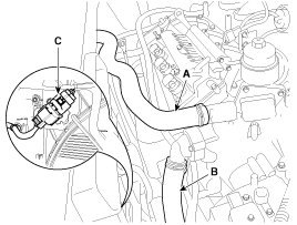 6. Remove the radiator upper hose (A), lower hose (B) and then disconnect the fan motor connector(C).