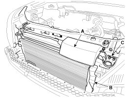 11. Remove the guard (B) and radiator mounting bracket (C).