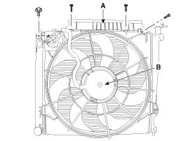 13. Separate the condenser from the radiator and then remove the upper cover (A) and cooling fan assembly (B).