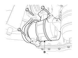 6. Disconnect the compressor clutch connector (B), and then remove 3 mounting bolts and the compressor.