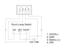 1. Remove the room lamp assembly then check for continuity between terminals.