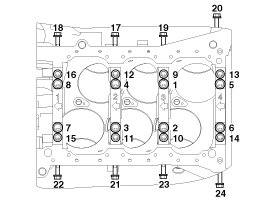 Install and uniformly tighten the bearing cap bolts, in several passes, in the sequence shown.