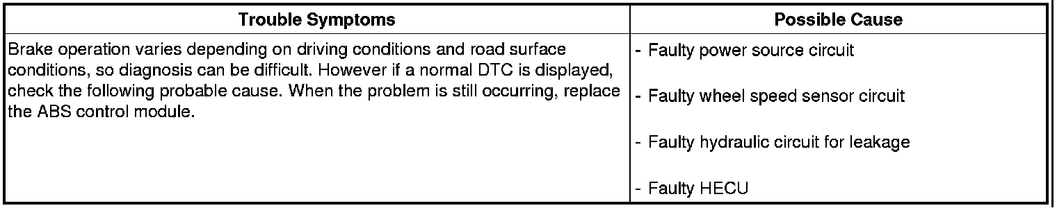 During ABS operation, the brake pedal may vibrate or may not be able to be depressed. Such phenomena are due to intermittent changes in hydraulic pressure inside the brake line to prevent the wheels from locking and is not an abnormality.