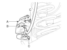 2. Remove the hose eyebolt (B) and caliper mounting bolts (C), then remove the rear caliper assembly (A).