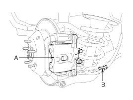1. Remove the guide rod bolt (B) and pivot the caliper (A) up out of the way.
