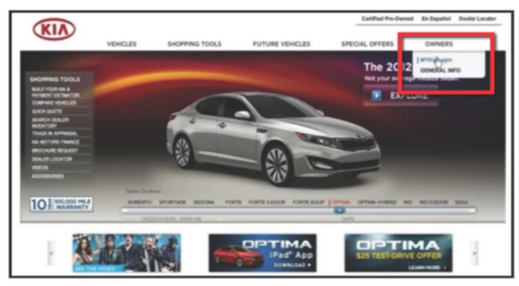 On the Kia Home page, go to the "OWNERS" tab and click on "MYKia Login."