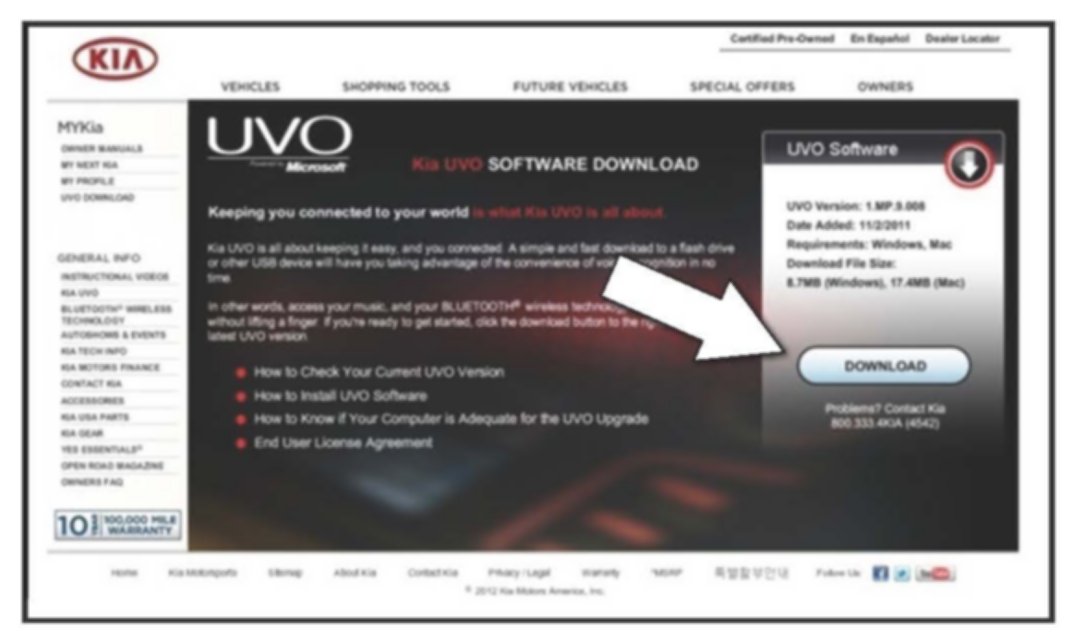 This bulletin provides the retail customers procedure for upgrading the Kia UVO (Your Voice) system. Kia UVO owners have the option to download available upgrades directly from the Kia.com website and can perform the upgrade themselves or have the dealer perform the upgrade in which case additional labor charges may apply. For customers who perform their own upgrade, Kia provides the customer with software and upgrade instructions If the customer opts to have the dealer perform the upgrade, the upgrade procedure is outlined in this bulletin.