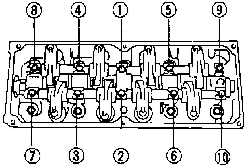 Fig. 10 Cylinder Head Bolt & Rocker Arm Bolt Tightening Sequence: