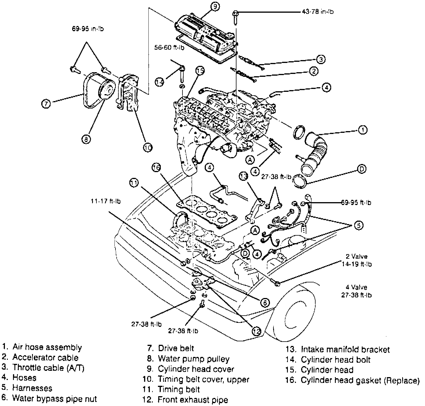 b. Disconnect distributor, oxygen sensor, fuel injector, throttle position sensor, idle speed control solenoid valve, ignition coil, engine coolant temperature sender and switch and engine ground cable.