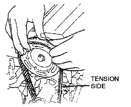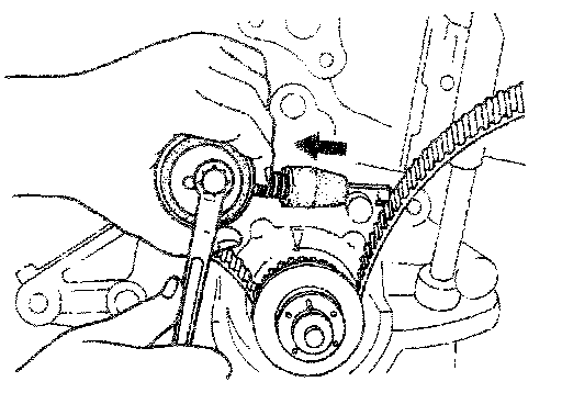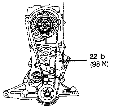 9. Check the timing belt deflection by applying moderate pressure [22 lb (98 N)] midway between the crankshaft pulley and the camshaft pulley. If the timing belt deflection is not correct temporarily secure tensioner lock bolt so the spring is fully extended and repeat steps 4-8 above or replace the tensioner spring.