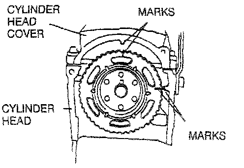5. Verify that the camshaft pulley marks are aligned with the cylinder head cover mark. If not aligned, remove the timing belt and repeat from tensioner installation.