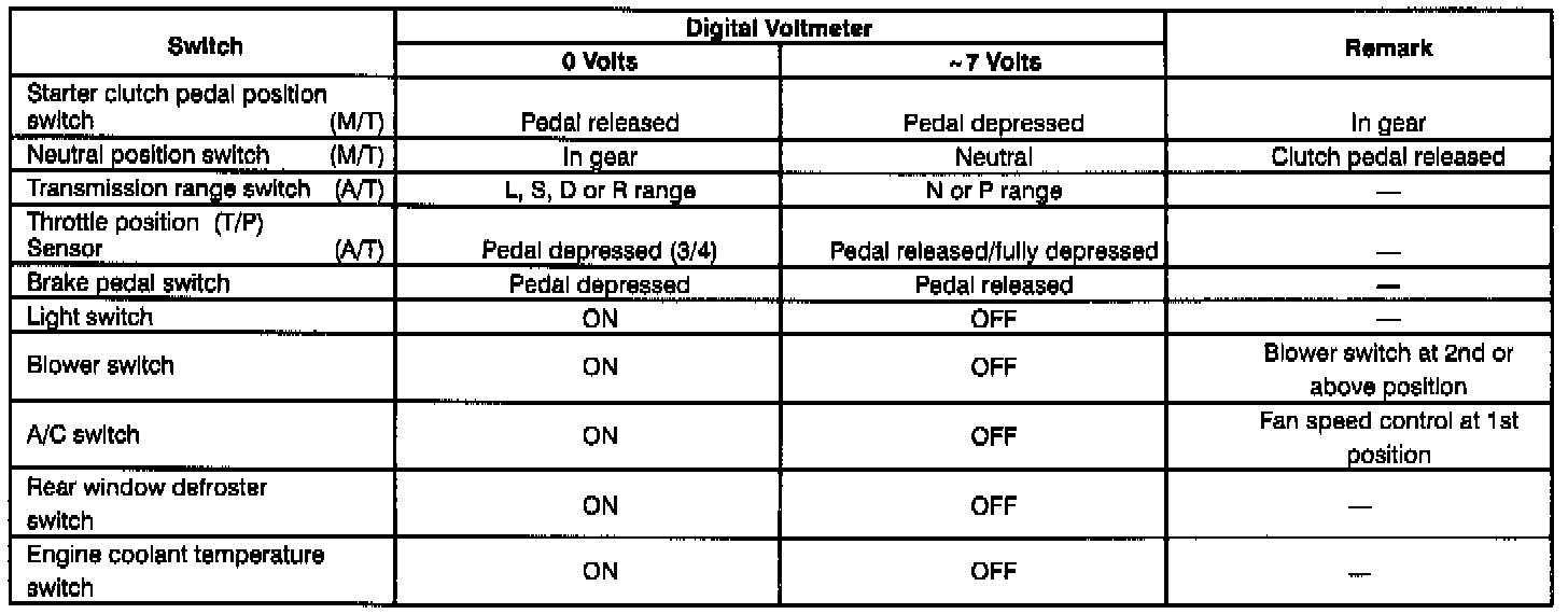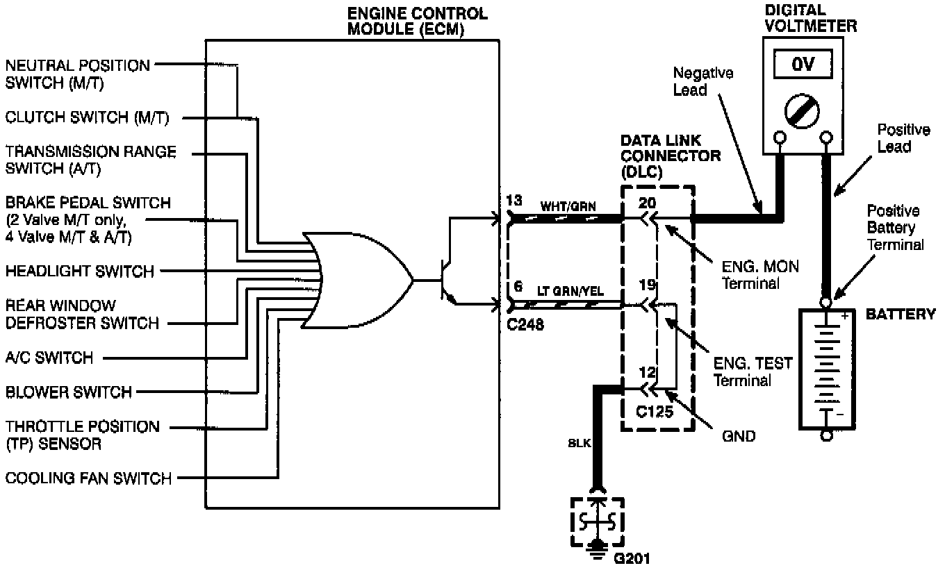 - Place a digital voltmeter in series between the battery and the ENG. MON. terminal of the data link connector (DLC).