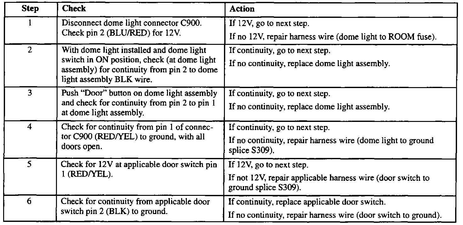 Check condition of ROOM fuse. If fuse is open, locate and repair source of overload. Replace fuse. Also, check dome light bulb. Replace if necessary.