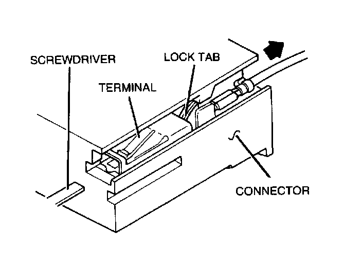 Insert a push-tool, or thin piece of metal such as a small screwdriver, from the terminal side of the connector, and then with the locking tabs pressed down, pull the terminal out from the rear side of the connector.