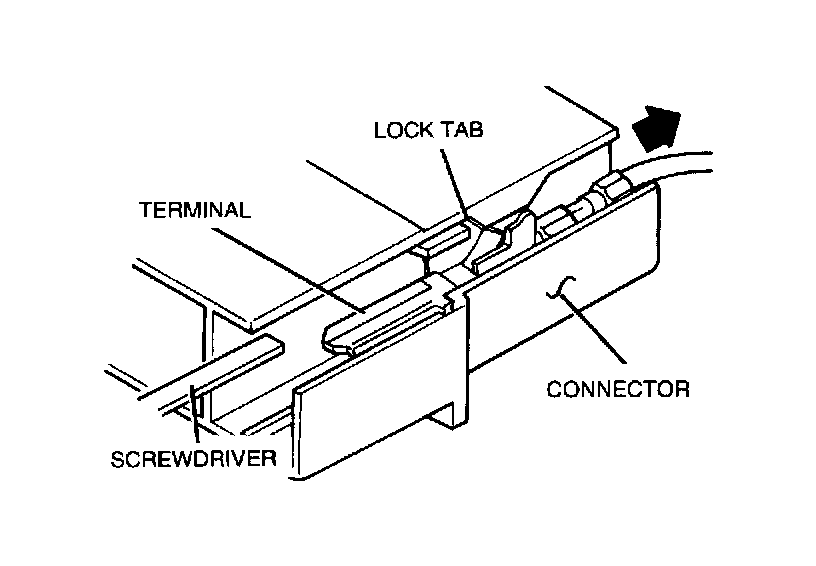 Insert a push-tool, or thin piece of metal such as a small screwdriver, from the terminal side of the connector, and then with the locking tabs pressed down, pull the terminal out from the rear side of the connector.