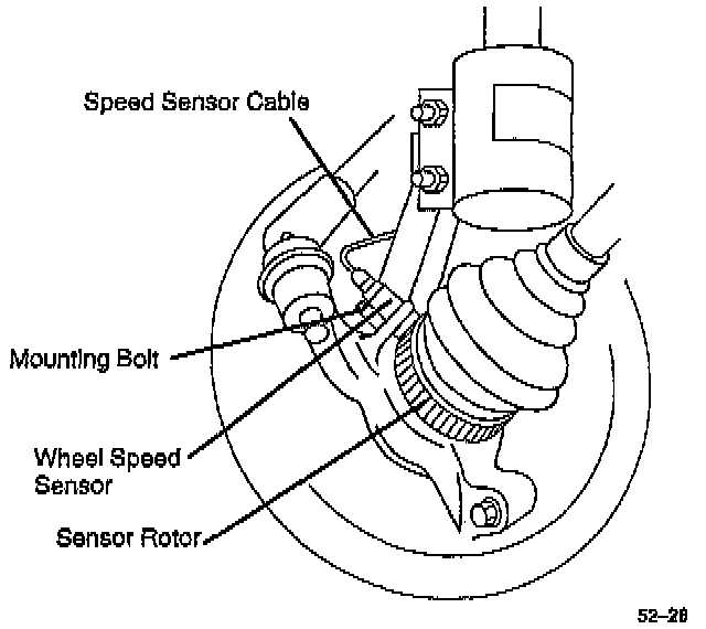 5. Remove the single mounting bolt securing the wheel speed sensor and draw it out of its bore. Protect the sensor's body from damage when it is not being serviced.