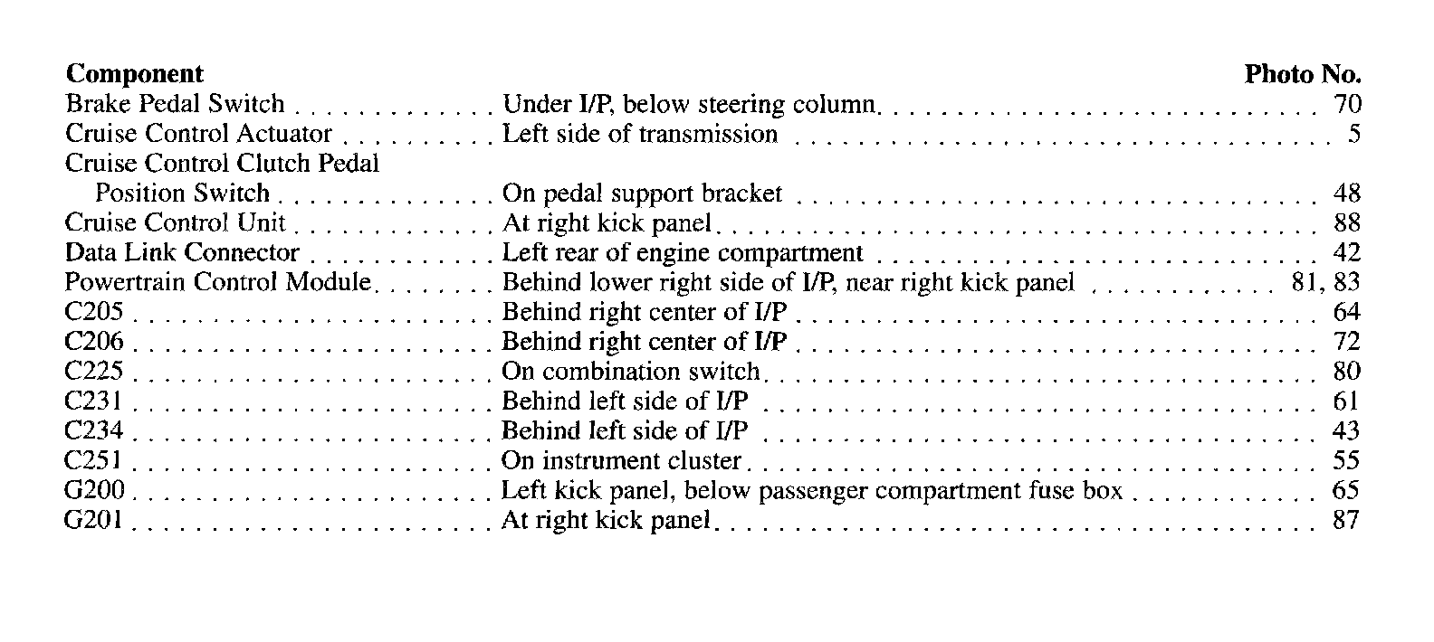 A component location index follows each schematic. Except for the location of obvious components, like Headlights, the index lists the location of every component, connector and ground in the schematic. The index also gives references to component location photographs.