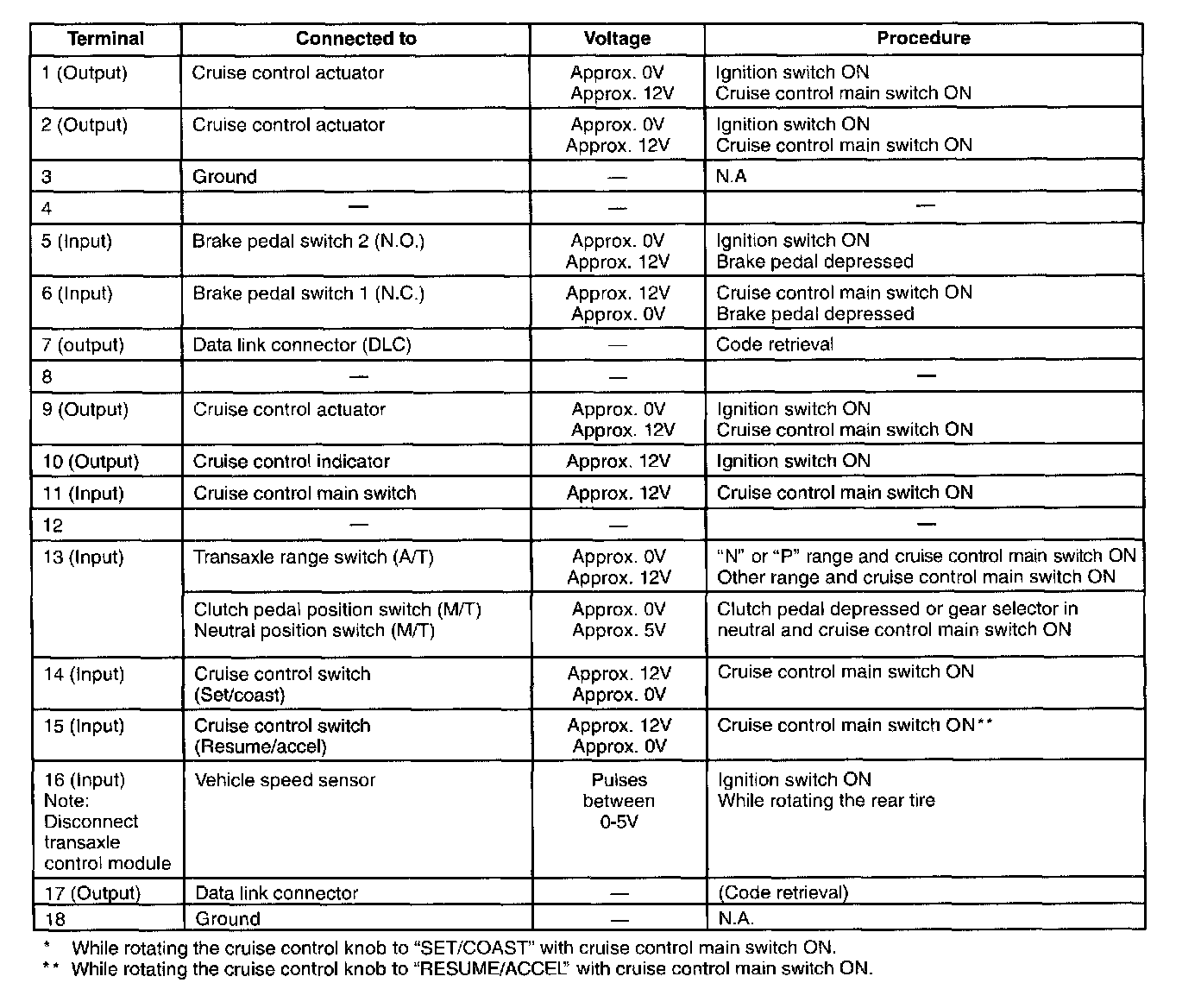 3. If the voltage measured is not in agreement with the voltage listed in the table, and the table lists the terminal as an output, then consider the cruise control unit to be defective. If the terminal is listed as an input, then refer to other circuit tests that cover the component to which that terminal is connected.