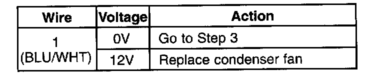 2. Apply 1 2V to terminal (BLU/WHT) and ground terminal (BLK) and verify that the condenser fan operates.