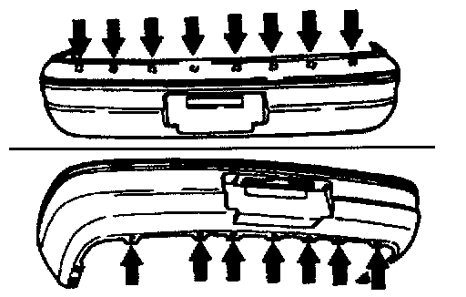 6. After the bumper assembly is removed from the body, remove the fasteners which connect the bumper face assembly to the bumper reinforcement (arrows).