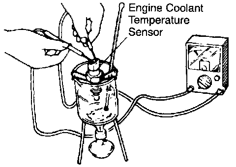 1. Place the engine coolant temperature sensor in water with a thermometer and heat the water gradually.