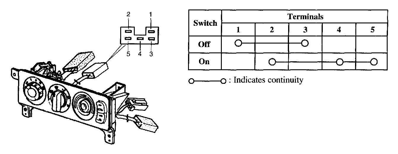 1. Remove the A/C switch and check continuity between terminals.