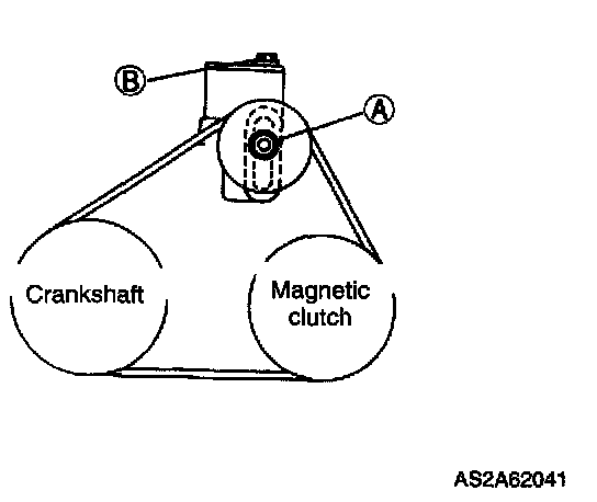 2. Turn adjusting bolt B and adjust the deflection of the drive belt to within specification.
