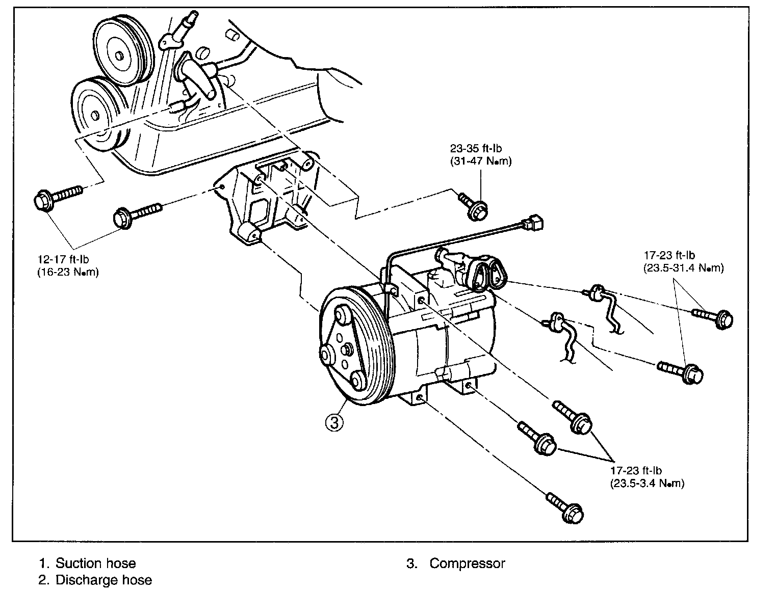 - Tightening torque: compressor inlet and outlet 17-23 ft-lb (23.5-3.4 N.m) Adjust the belt tension to specification.