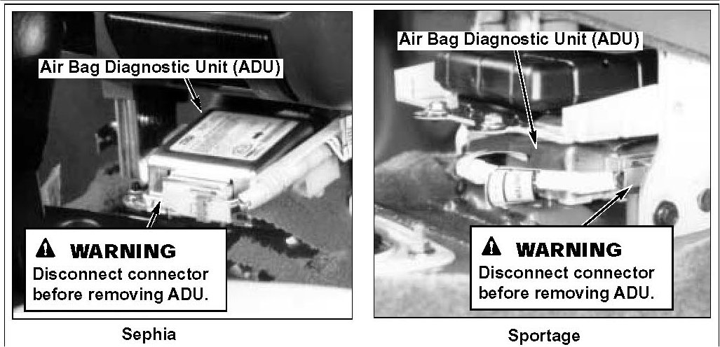 The Air Bag system used in all Sportage and 1/96 production and later Sephia models are the single-point-sensing type. The Air Bag Sensor and Air Bag Safing Sensor are located within the ADU to reduce the number of individual components required for the Air Bag-SRS. Reducing the number components, and eliminating their required wiring, further reduces the possibility of a malfunction occurring within the Air Bag-SRS. Because of this, it is extremely important to exercise caution when handling the ADU during service/system diagnosis.